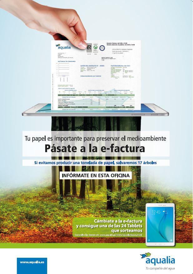 En este contexto, el Servicio Municipal de Aguas de Oviedo recuerda que para producir una tonelada de papel, se requieren unos 17 árboles y 100.000 litros de agua, un coste medioambiental que podemos reducir convirtiendo la factura de papel en factura digital. Este es el objetivo de la campaña de Aqualia “Pásate a la e-factura”, que arranca con el objetivo de sumar a nivel nacional en el plazo de un año un millón más de facturas electrónicas que sustituyan al tradicional formato papel.