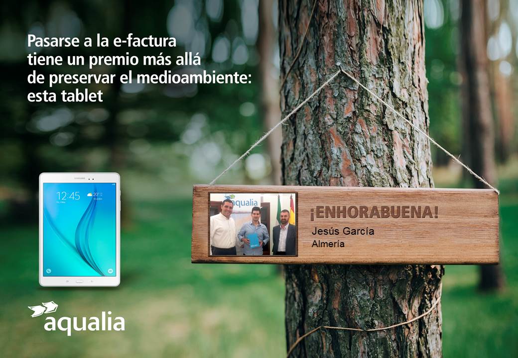 Jesús García, cliente de Aqualia en Almería ha sido uno de los dos primeros premiados por la Campaña “Pásate a la e-factura” lanzada por Aqualia. La campaña tiene como objetivo aumentar el número de clientes que reciben la factura electrónica en lugar de la factura tradicional en papel. El objetivo de Aqualia es lograr, en el plazo de un año, 1 millón de facturas electrónicas adicionales.