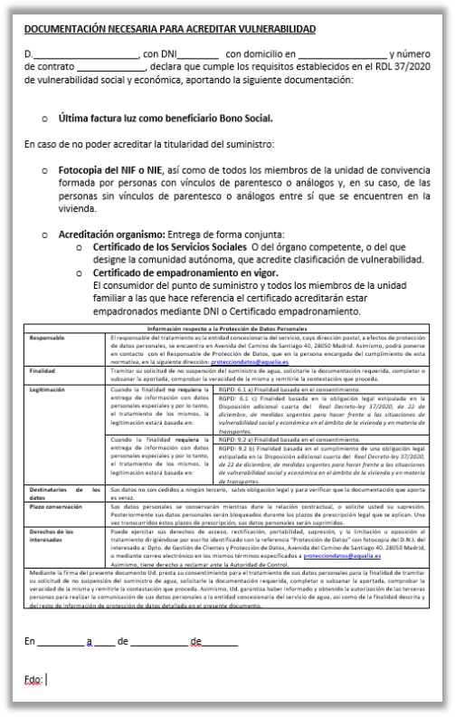 Para acreditar la situación de vulnerabilidad es necesario presentar este formulario* correctamente cumplimentado junto con la documentación requerida en el documento y presentarlo en las oficinas de Atención al Cliente de Aqualia.
